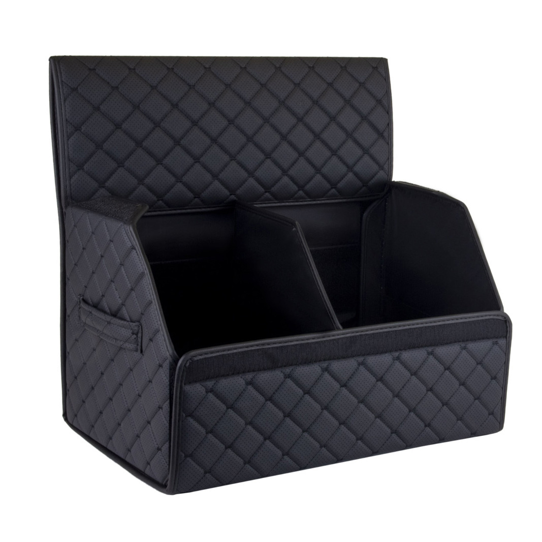 A vízlepergető anyagból készült rendező könnyen tisztítható és kopásálló. Az Alfa Cars ECO termék ötvözi a funkcionalitást, tartósságot és a prémium dizájnt. A fekete rombusz mintás kivitel fekete varrással minden autóhoz illik.